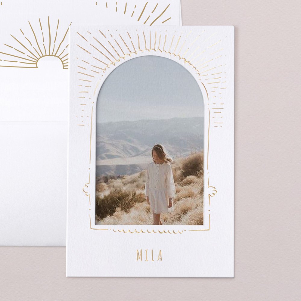 Ennobli par des finitions dorées, le faire-part Aurora dresse un joli tableau de communion, où la photographie de votre enfant est au centre de toutes les attentions. Ce modèle empreint de charme plaira assurément aux proches conviés à l'événement.