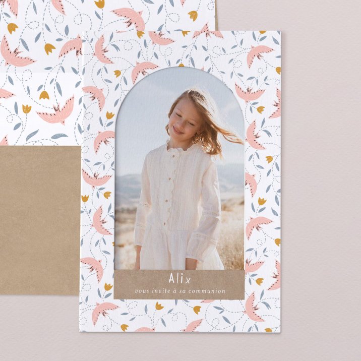 Avec son joli motif aux tendres couleurs pastel, encadrant la photo de votre enfant, le faire-part de communion Un air d'été II égayera assurément le cœur des proches conviés à ce réjouissant événement.