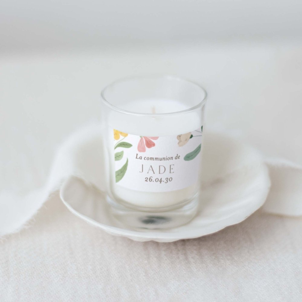 Offrez à vos invités un chaleureux souvenir de la communion de votre enfant : la petite bougie personnalisée. Son délicat parfum aux notes de figuier transportera vos proches vers le souvenir d’instants de joie partagés.