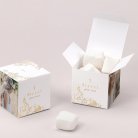 Pour enchanter vos invités, garnissez ce petit cube surprise de délicieuses dragées (disponibles en option), fabriquées artisanalement dans le sud de la France. Nous vous conseillons d’ajouter 20 dragées par boîte (50 g).