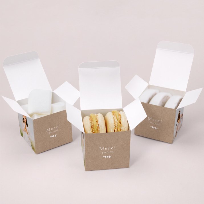 Pour enchanter vos invités, garnissez ce petit cube surprise de délicieuses dragées (disponibles en option), fabriquées artisanalement dans le sud de la France. Nous vous conseillons d’ajouter 20 dragées par boîte (50 g).