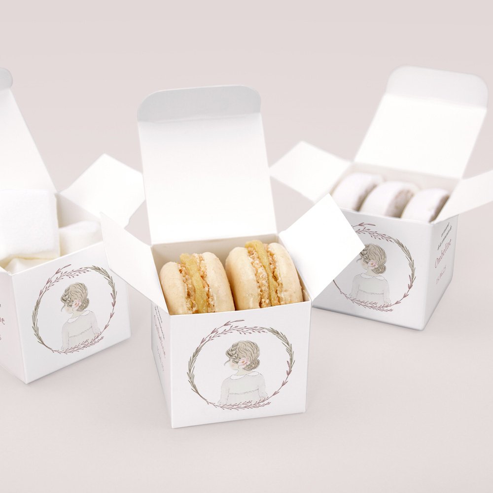 Pour enchanter vos invités, garnissez ce petit cube surprise de délicieuses dragées (disponibles en option), fabriquées artisanalement dans le sud de la France. Nous vous conseillons d’ajouter 20 dragées par boîte (50 g).