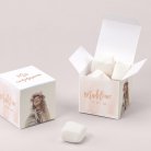 Pour enchanter vos invités, garnissez ce petit cube surprise de délicieuses dragées (disponibles en option), fabriquées artisanalement dans le sud de la France. Nous vous conseillons d’ajouter 20 dragées par boîte (50 g).