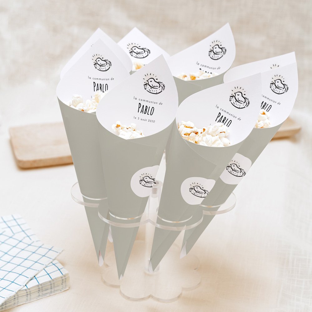 Placés dans une jolie corbeille sur votre table et garnis de pop-corns, de bonbons ou encore de confettis, les cornets à gourmandises apporteront une touche originale à votre décoration de communion.