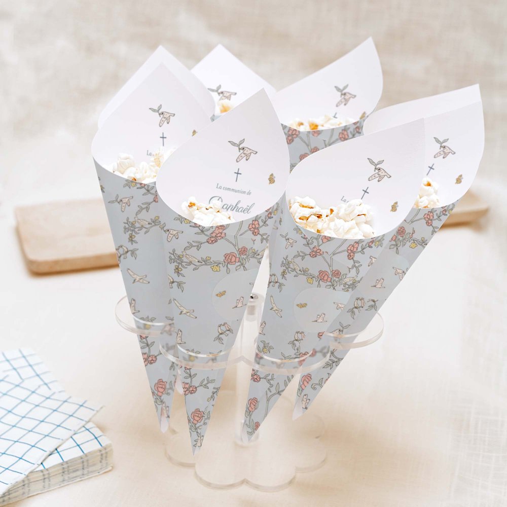 Placés dans une jolie corbeille sur votre table et garnis de pop-corns, de bonbons ou encore de confettis, les cornets à gourmandises apporteront une touche originale à votre décoration de communion.