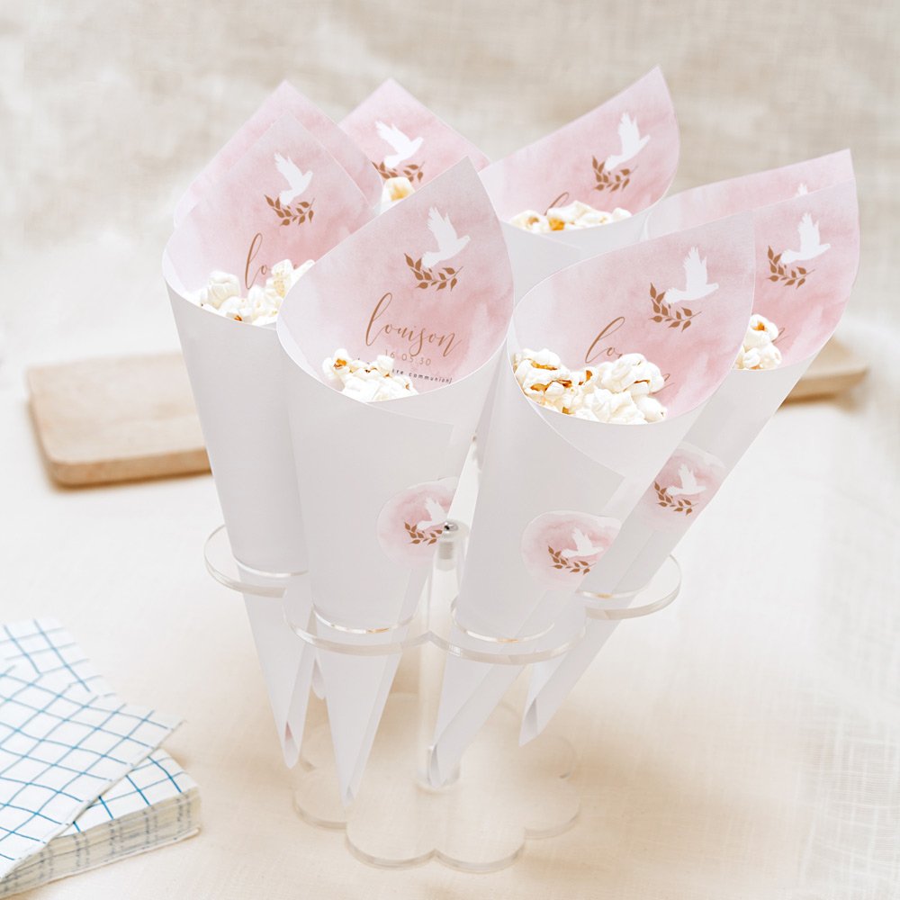Placés dans une jolie corbeille sur votre table et garnis de pop-corns, de bonbons ou encore de confettis, les cornets à gourmandises apporteront une touche originale à votre décoration de communion.