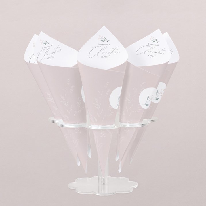Placés dans une jolie corbeille sur votre table et garnis de pop-corns, de bonbons ou encore de confettis, les cornets à gourmandises apporteront une touche originale à votre décoration de communion.