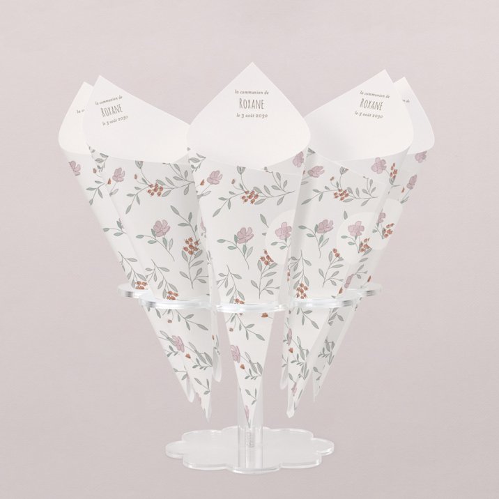 Placés dans une jolie corbeille sur votre table et garnis de pop-corns, de bonbons ou encore de confettis, les cornets à gourmandises apporteront une touche originale à votre décoration de communion.