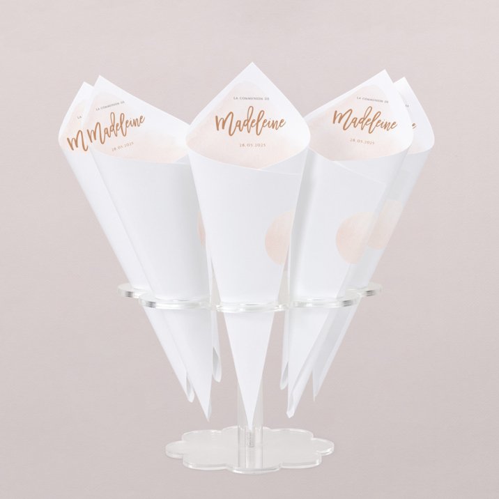 Placés dans une jolie corbeille sur votre table et garnis de pop-corns, de bonbons ou encore de confettis, les cornets à gourmandises apporteront une touche originale à votre décoration de communion.