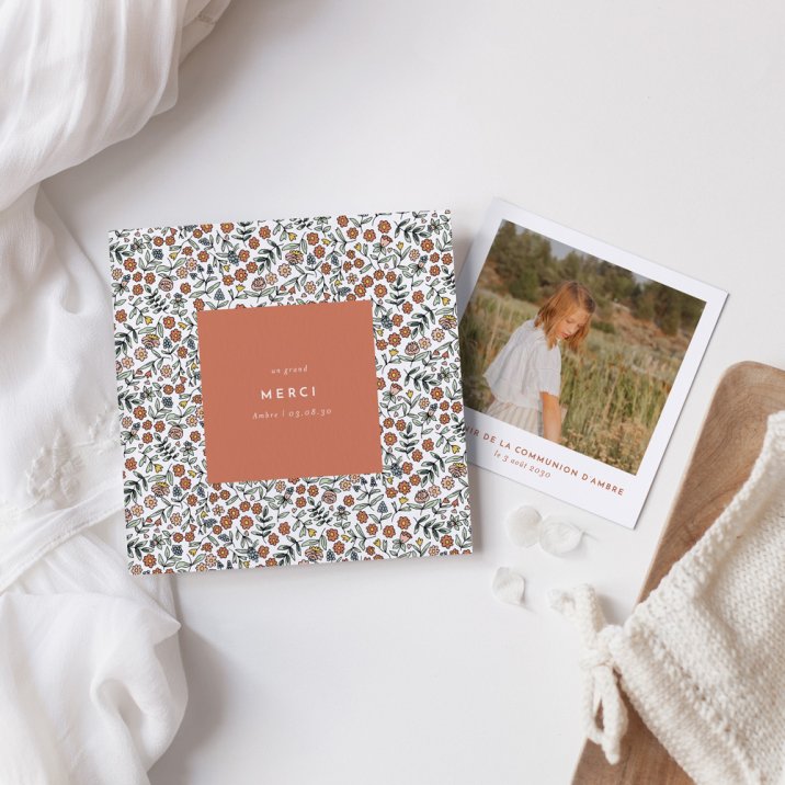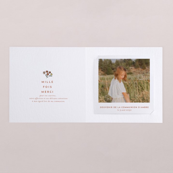 Remerciez les proches présents à la communion de votre enfant avec une jolie carte personnalisée. Cette carte de remerciements s'accompagne d'un cadeau, glissé à l'intérieur : un polaroid (non magnétisé) de votre enfant qu'ils pourront afficher selon leur inspiration, glisser dans un album photo, utiliser comme marque-page...
