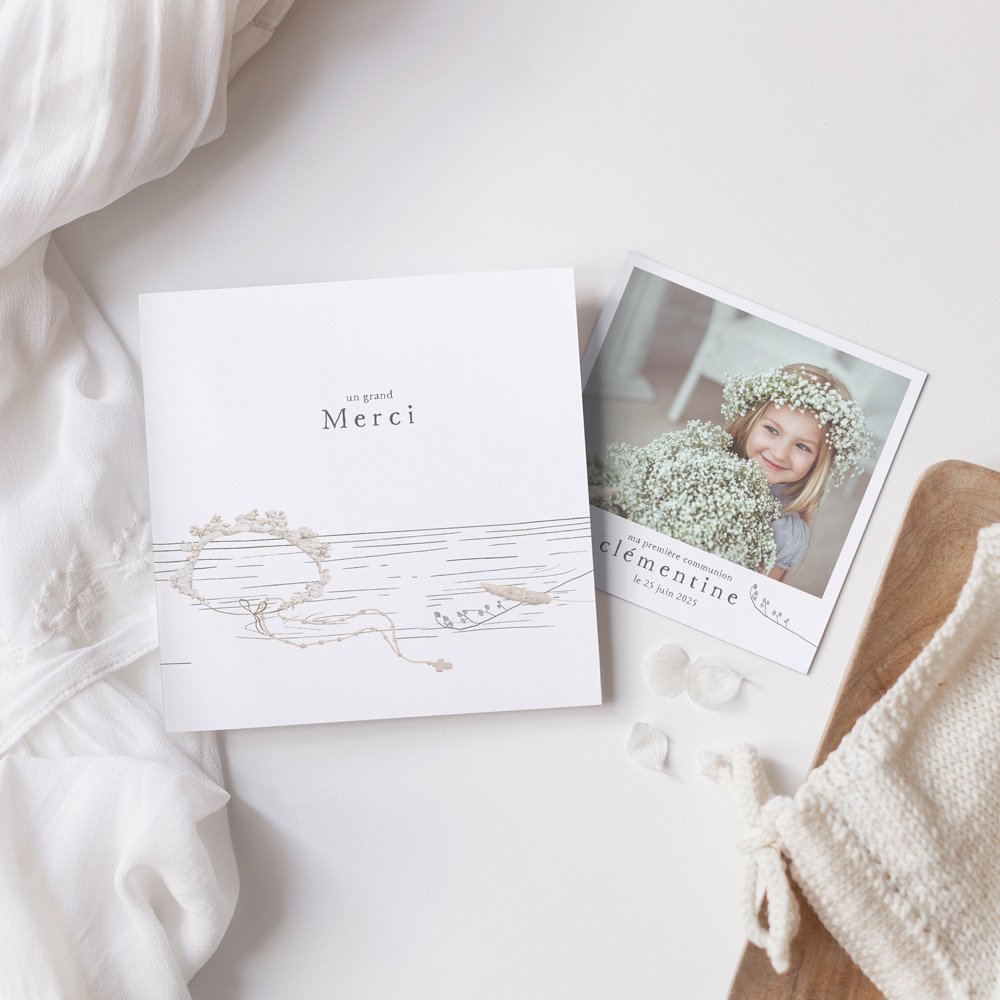 Remerciez les proches présents à la communion de votre enfant avec une jolie carte personnalisée. Cette carte de remerciements s'accompagne d'un cadeau, glissé à l'intérieur : un polaroid (non magnétisé) de votre enfant qu'ils pourront afficher selon leur inspiration, glisser dans un album photo, utiliser comme marque-page...