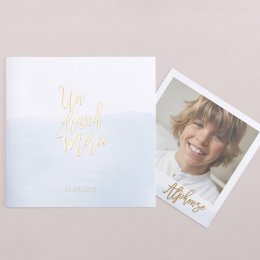 Remerciez les proches présents à la communion de votre enfant avec une jolie carte personnalisée. Cette carte de remerciements s'accompagne d'un cadeau, glissé à l'intérieur : un polaroid (non magnétisé) de votre enfant qu'ils pourront afficher selon leur inspiration, glisser dans un album photo, utiliser comme marque-page...