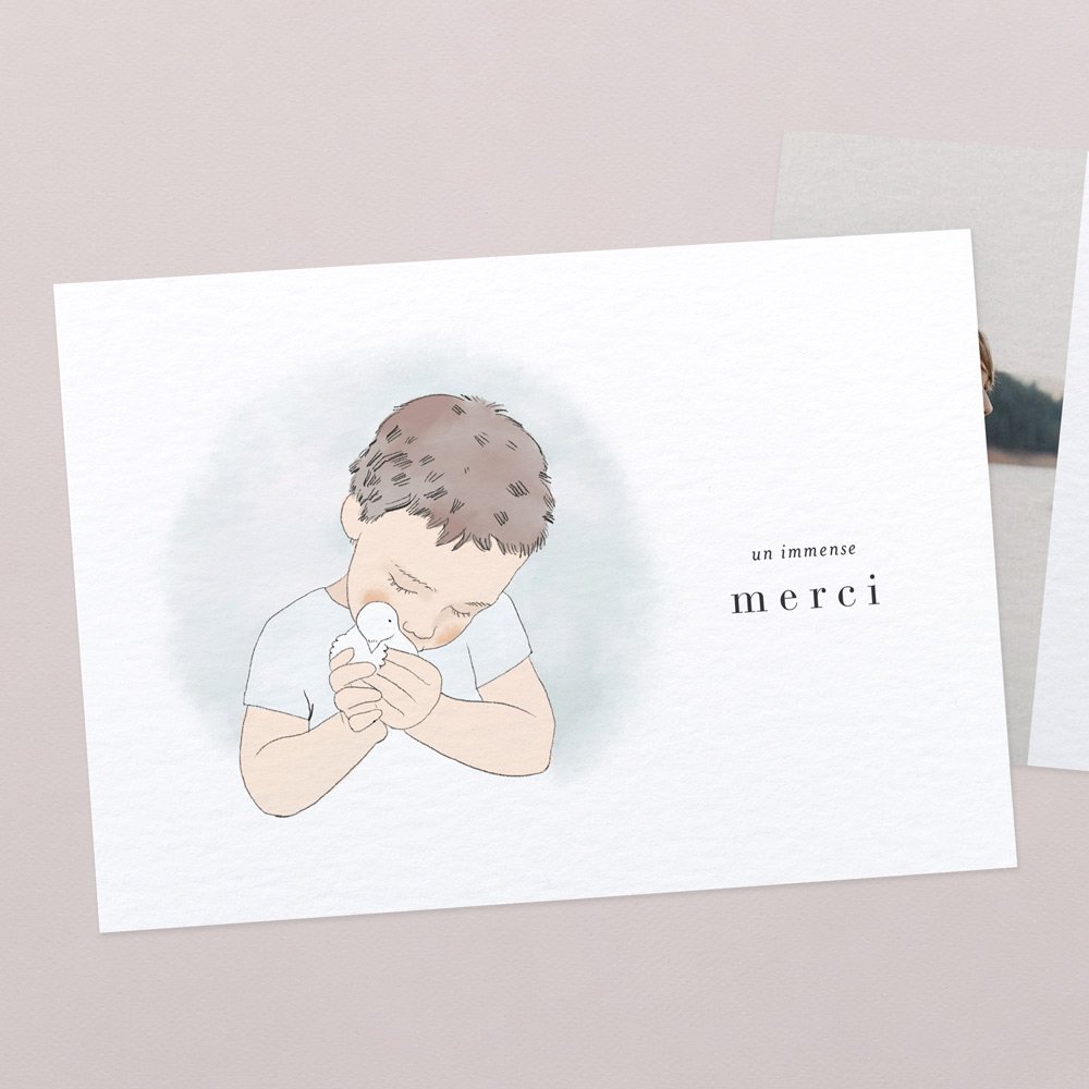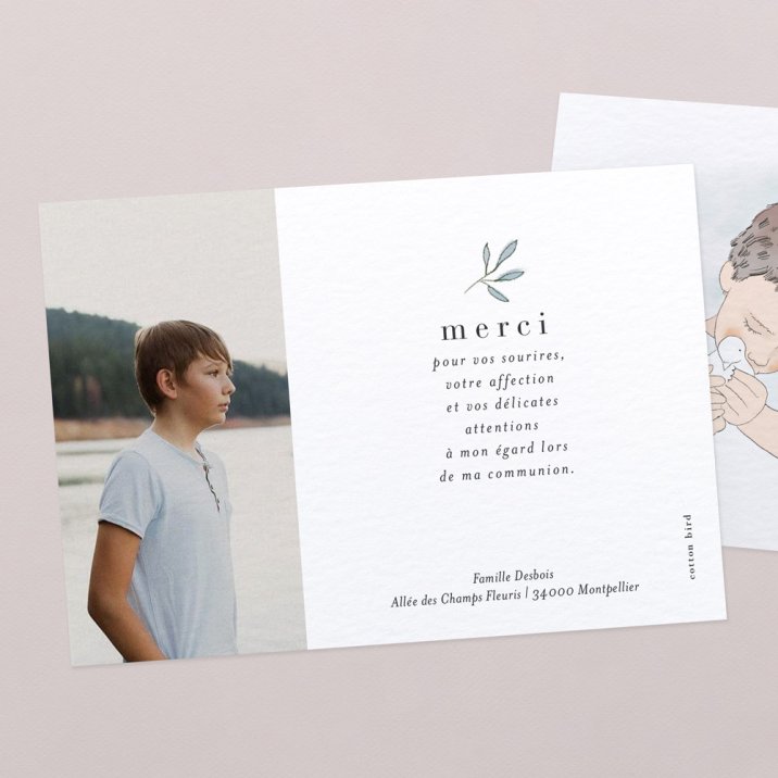 Remerciez les proches présents à la communion de votre enfant grâce à une jolie carte de remerciements. Elle se personnalise au recto et au verso avec votre message et vos photos (selon le modèle).