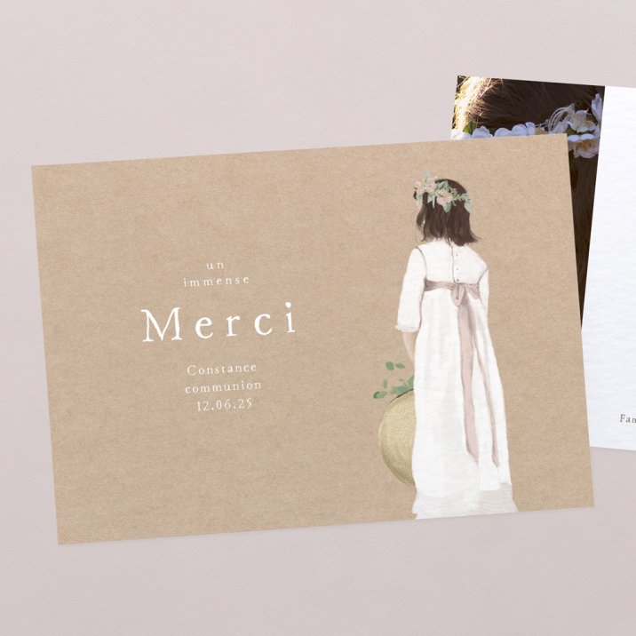 Remerciez les proches présents à la communion de votre enfant grâce à une jolie carte de remerciements. Elle se personnalise au recto et au verso avec votre message et vos photos (selon le modèle).