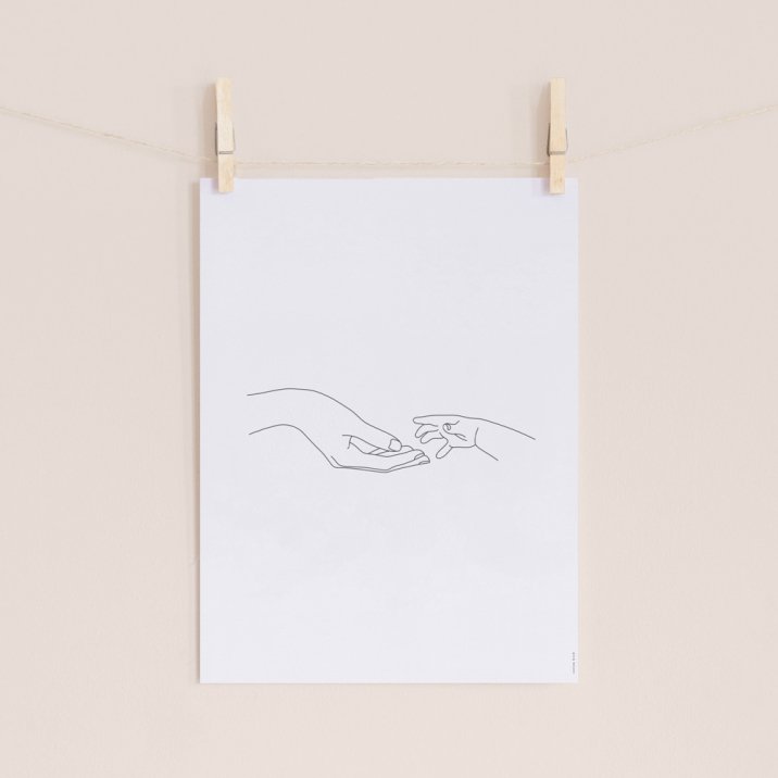 Découvrez l'affiche Filio. Une illustration au trait pleine de douceur mettant en scène la main d'un bébé tentant d'attraper celle de sa maman ou de son papa. Un adorable clin d'œil aux premiers pas de bébé !