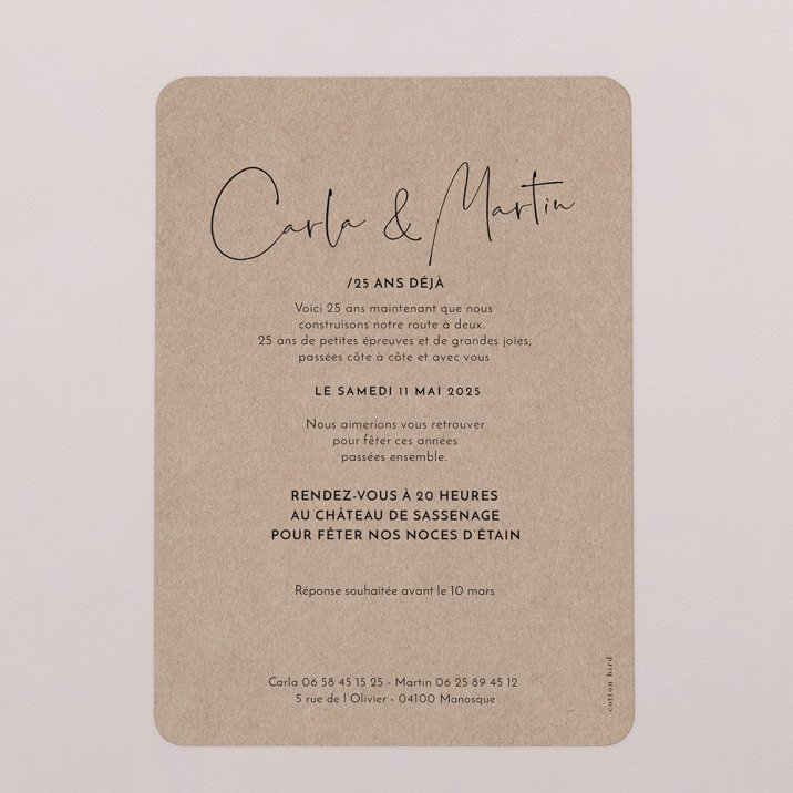 Conviez vos proches à célébrer vos noces d'argent avec cette carte d'invitation anniversaire de mariage et sa jolie typographie manuscrite.