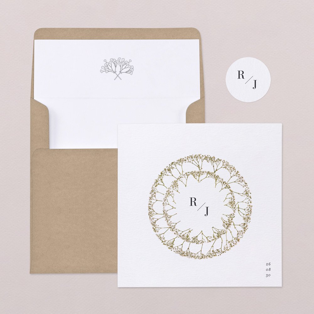 Élégant et minimaliste, le faire-part de mariage Gypsophila s'accordera parfaitement à toutes les décorations. Laissez-vous séduire par cette couronne de gypsophile, un ornement poétique symbole de bonheur et d'amour éternel.