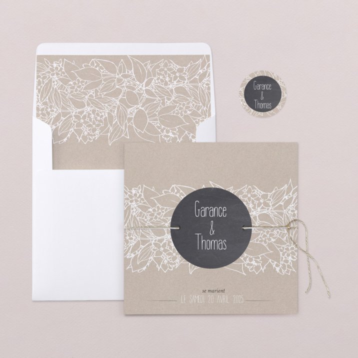Ce faire-part se présente sous la forme d'une carte carrée pliée par le milieu. Les trois perforations vous permettront de glisser un joli ruban (au choix, en supplément) pour une touche d'élégance supplémentaire.