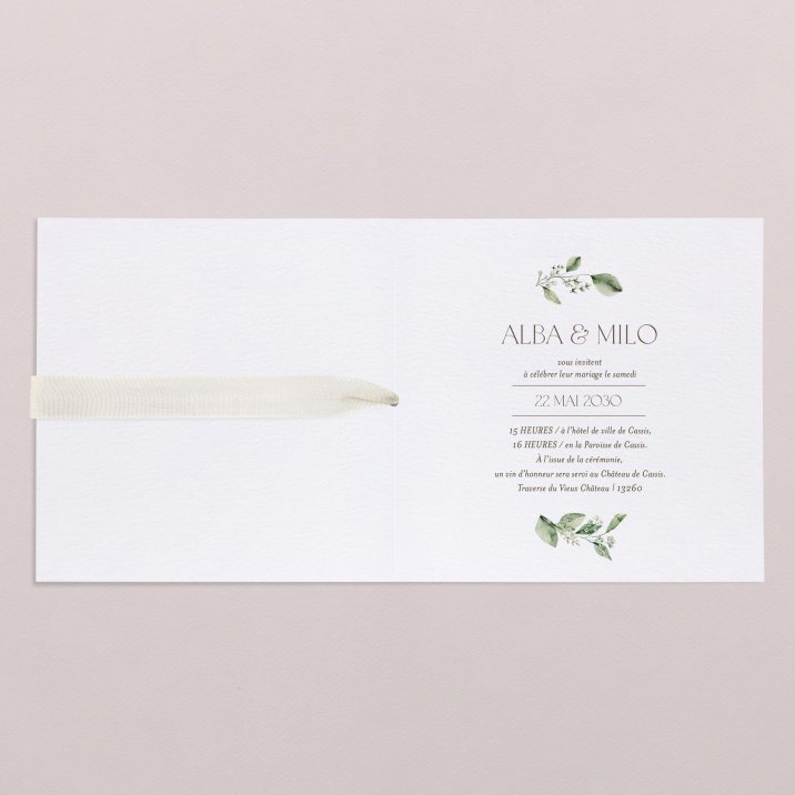 La nature rencontre l’élégance sur le faire-part de mariage Amedeo. Une sublime couronne végétale encadre vos prénoms sur ce modèle intemporel, idéal pour une célébration dans un cadre champêtre.