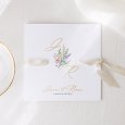 Ce faire-part se présente sous la forme d'une carte carrée pliée par le milieu. Les trois perforations vous permettront de glisser un joli ruban (au choix, en supplément) pour une touche d'élégance supplémentaire.