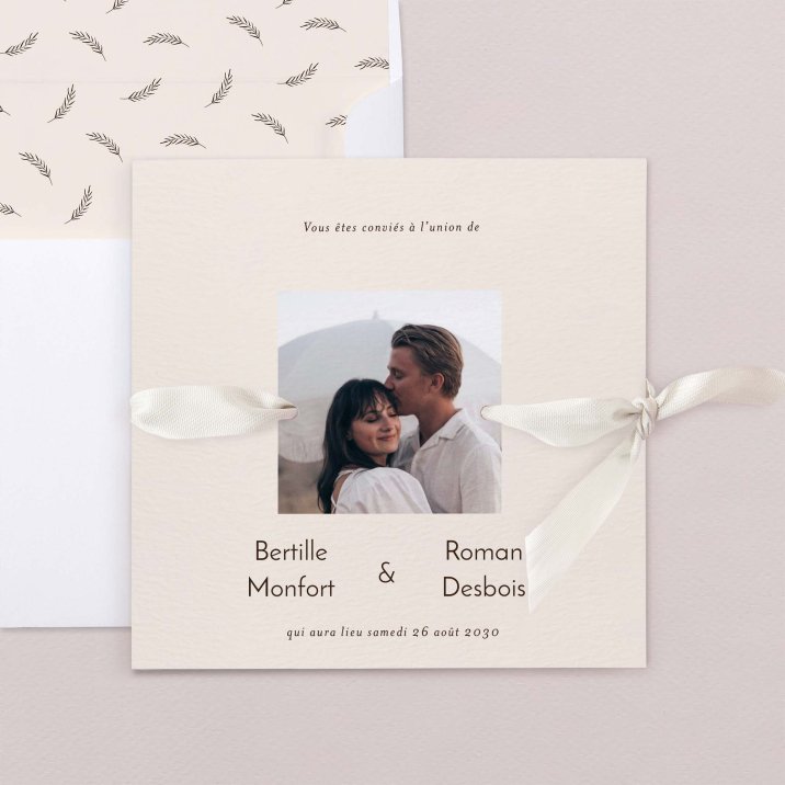 Ce faire-part se présente sous la forme d'une carte carrée pliée par le milieu. Les trois perforations vous permettront de glisser un joli ruban (au choix, en supplément) pour une touche d'élégance supplémentaire.