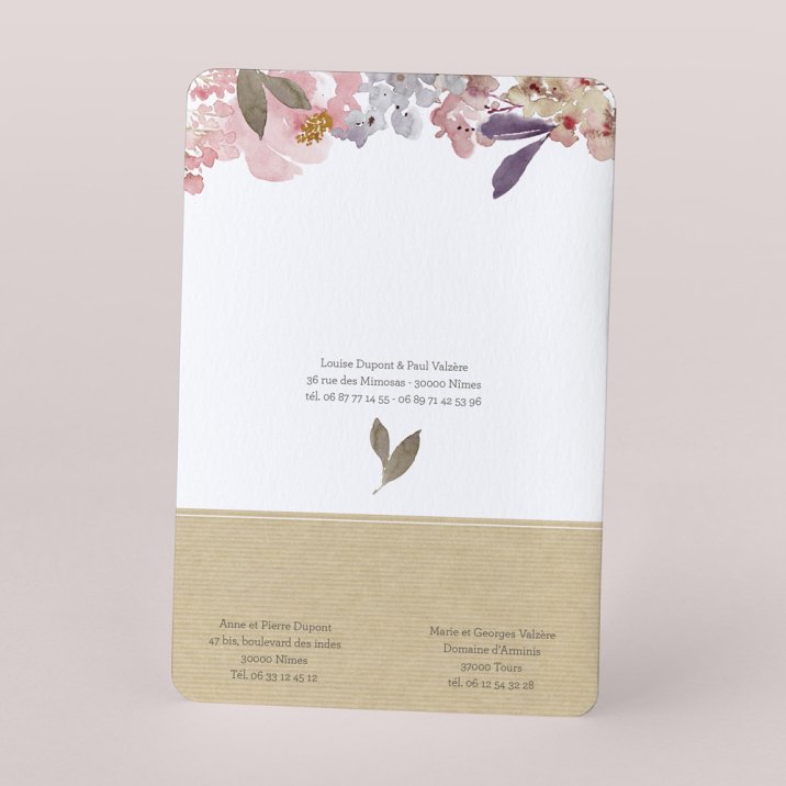 Ce faire-part présente un format portrait plié. Sa silhouette classique est adoucie par des coins arrondis. Il s'accompagne d'une étiquette ronde personnalisée, à attacher à l'aide d'un joli lien (proposé en accessoire).
