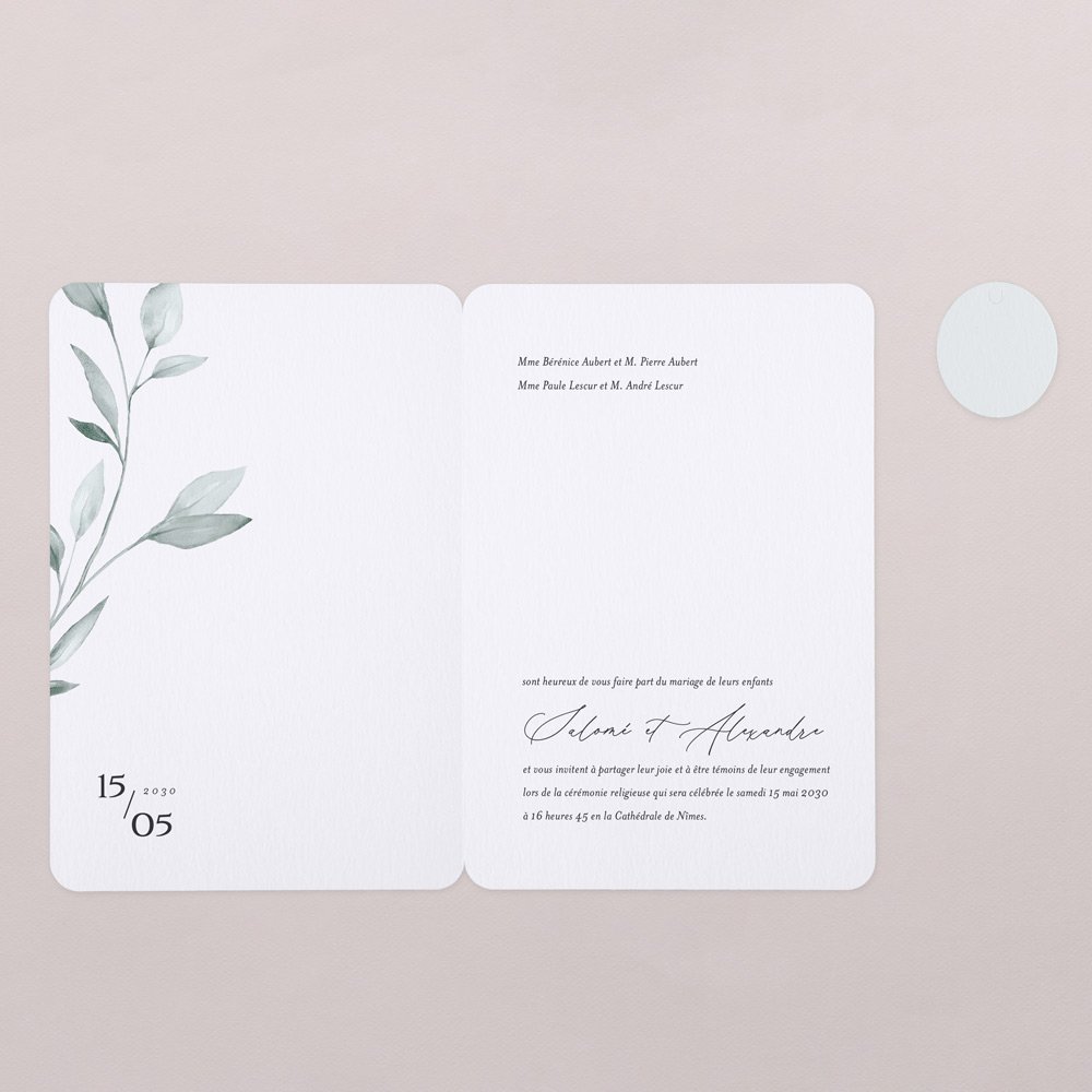 Ce faire-part présente un format portrait plié. Sa silhouette classique est adoucie par des coins arrondis. Il s'accompagne d'une étiquette ronde personnalisée, à attacher à l'aide d'un joli lien (proposé en accessoire).