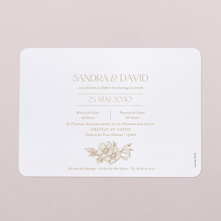 D’élégantes dorures s’invitent sur le faire-part de mariage L’Estate. Les initiales de vos prénoms et une couronne de généreuses fleurs s’habillent d’or sur cette création, présageant une union d’exception.