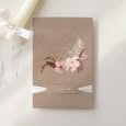 Sur le faire-part de mariage Copper Flowers, une élégante couronne de fleurs séchées et d’orchidées encadre vos prénoms. Avec ses douces tonalités rosées, son lettrage cuivré et son papier couleur kraft, cette composition bohème enchantera tous vos invités.