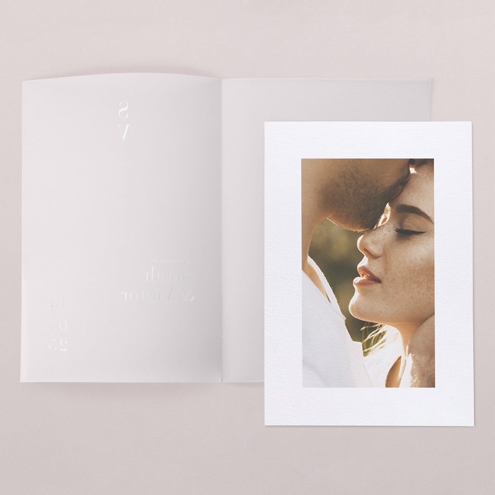Succombez ici à la poésie qui se dégage de Blanca III, un élégant faire-part de mariage épuré avec la finition or sur le calque pour un jeu de transparence subtil et raffiné.