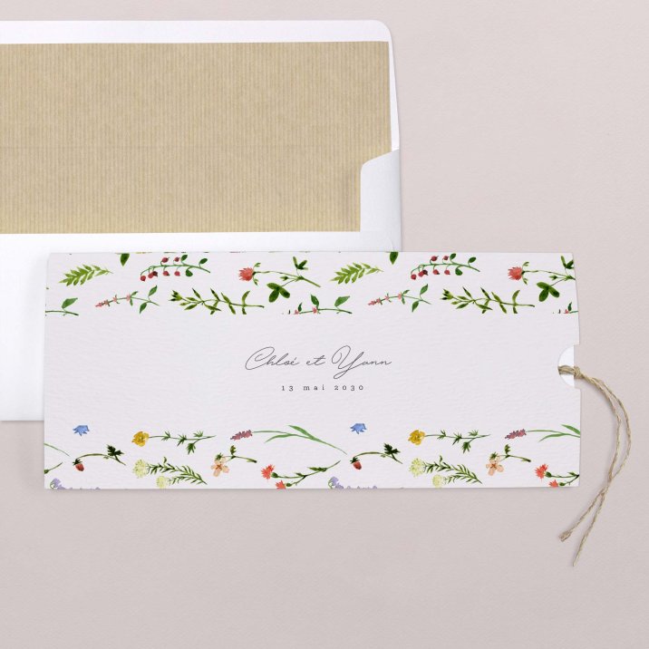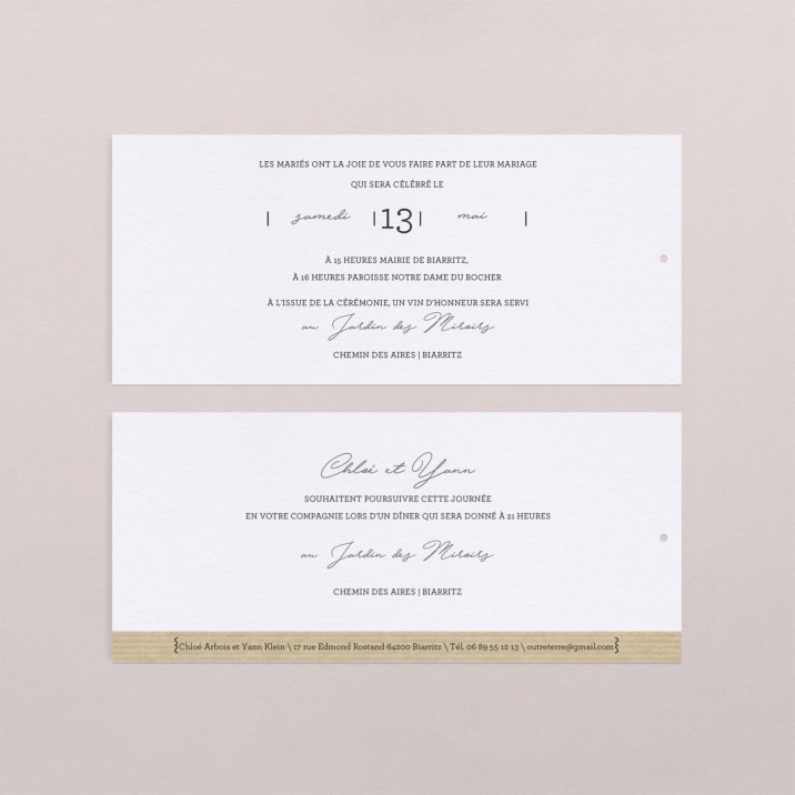 Ce faire-part se présente sous la forme d'une pochette contenant deux cartes rectangulaires. Pour une touche d'élégance supplémentaire, liez vos cartes avec un joli ruban (au choix et en supplément).