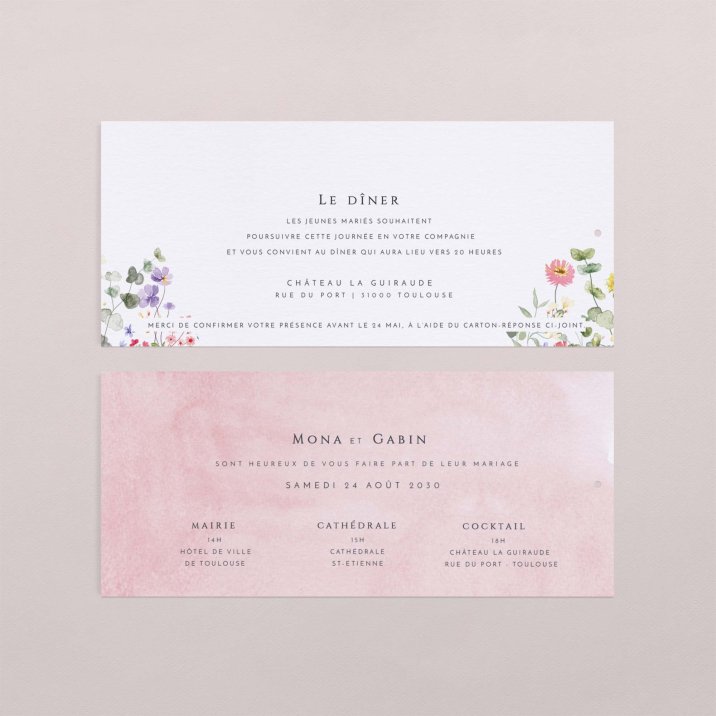 De délicates fleurs sauvages et colorées s’esquissent, en aquarelle, sur le faire-part de mariage Into the bloom. Une création poétique au doux charme printanier, parfaite pour annoncer votre mariage en cette saison, ou en été.