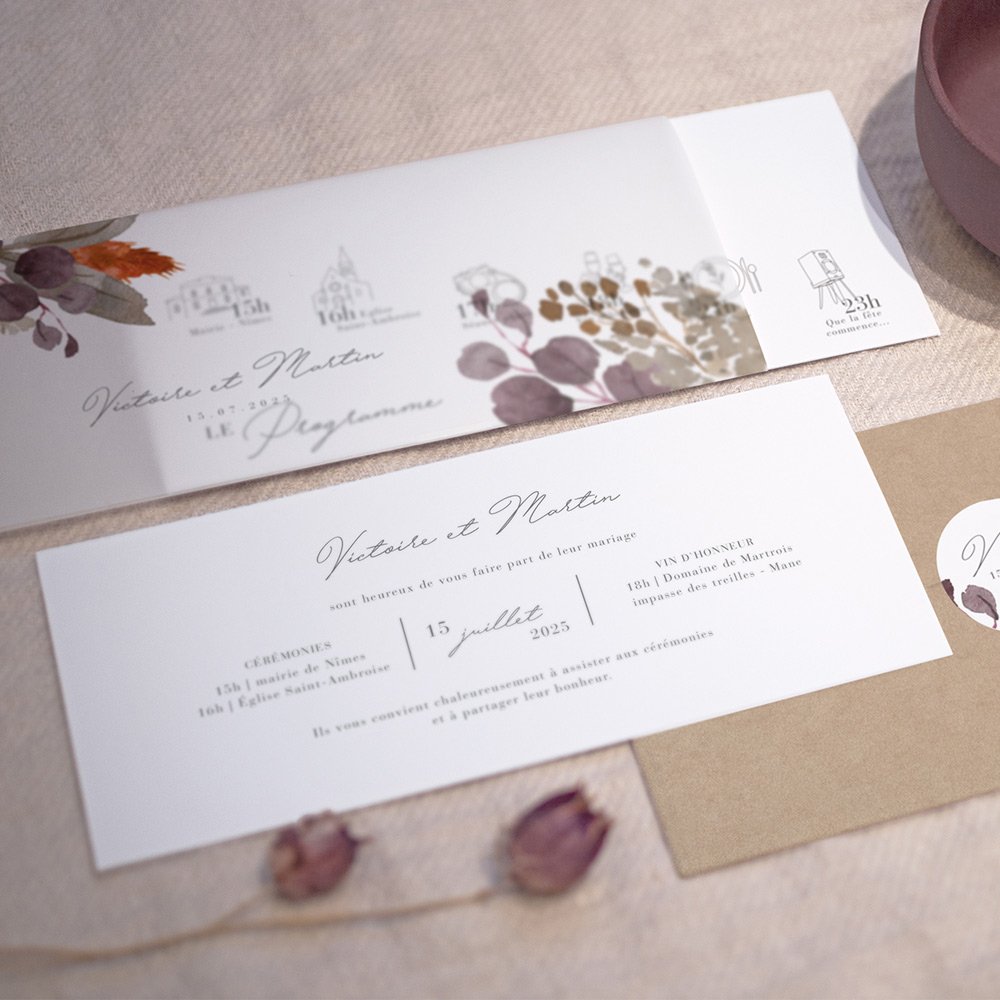 Ce faire-part est composé de deux cartes simples et d'un calque trois volets qui vient envelopper les cartes, le petit plus d'élégance et d'originalité pour un faire-part parfait.
