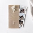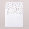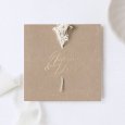 Ce faire-part se présente sous la forme d'une carte carrée à double-volet. Des perforations sont prévues sur le devant pour pouvoir y glisser un brin de fleurs séchées (à choisir en supplément). NB : Pour que vos destinataires puissent apprécier toute la splendeur des fleurs séchées ornant vos délicats faire-part, privilégiez une remise en main propre plutôt qu'un envoi postal.