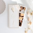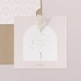 Ce faire-part se présente sous la forme d'une carte carrée à double-volet. Des perforations sont prévues sur le devant pour pouvoir y glisser un brin de fleurs séchées (à choisir en supplément). NB : Pour que vos destinataires puissent apprécier toute la splendeur des fleurs séchées ornant vos délicats faire-part, privilégiez une remise en main propre plutôt qu'un envoi postal.