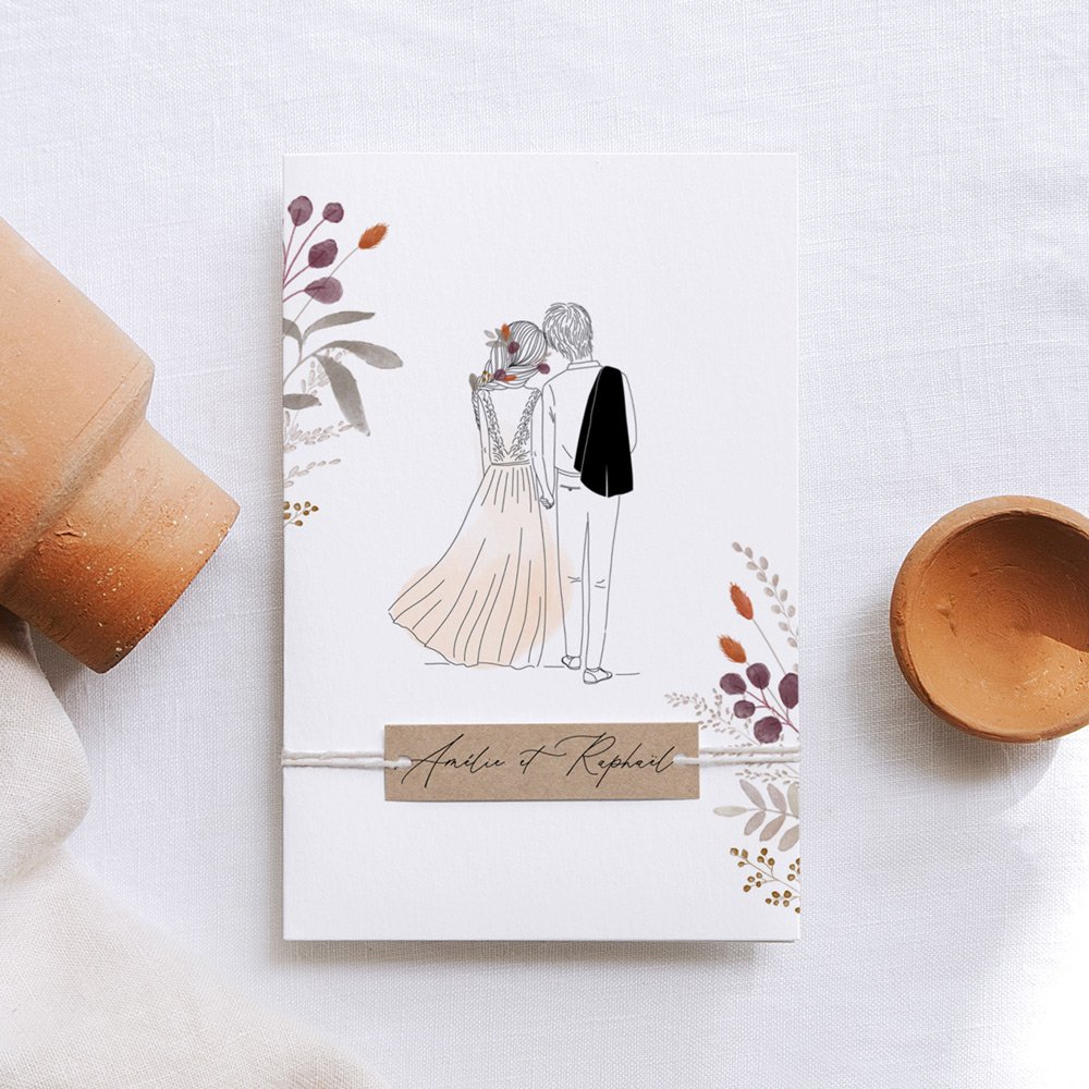 Votre couple joliment illustré accompagné de fleurs délicates aux tonalités hivernales... Laissez-vous séduire par la tendresse du faire-part de mariage Jardin d'Hiver.