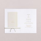 Ce modèle comprend 3 éléments : un faire-part, une carte glissée dans sa pochette interne et une étiquette à attacher sur le devant. Des perforations sont prévues sur le faire-part pour y glisser un joli ruban (au choix et en supplément), agrémenté de l'étiquette.