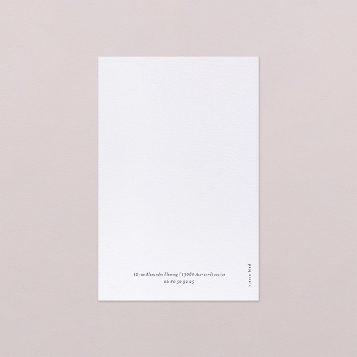 Ce modèle comprend 3 éléments : un faire-part, une carte glissée dans sa pochette interne et une étiquette à attacher sur le devant. Des perforations sont prévues sur le faire-part pour y glisser un joli ruban (au choix et en supplément), agrémenté de l'étiquette.