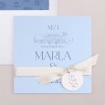 Ce modèle comprend 3 éléments : un faire-part, une carte glissée dans sa pochette interne et une étiquette à attacher sur le devant. Des perforations sont prévues sur le faire-part pour y glisser un joli ruban (au choix et en supplément), agrémenté de l'étiquette.