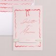Ce modèle comprend 3 éléments : un faire-part, une carte glissée dans sa pochette interne et une étiquette à attacher sur le devant. Des perforations sont prévues sur le faire-part pour y glisser un joli ruban (au choix et en supplément), agrémenté de l'étiquette.