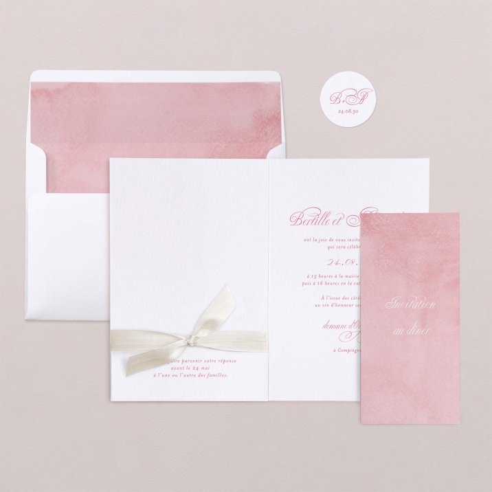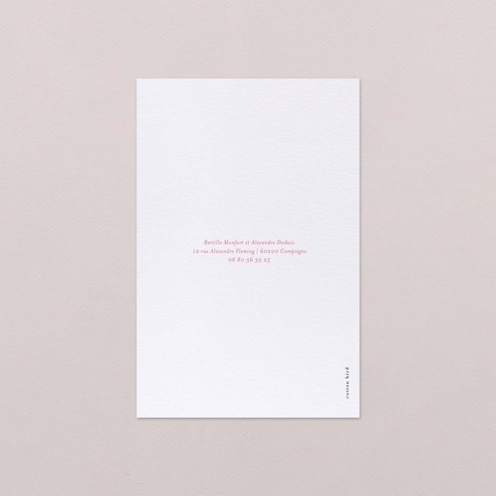 Ce modèle comprend 3 éléments : un faire-part, une carte glissée dans sa pochette interne et une étiquette à attacher sur le devant. Des perforations sont prévues sur le faire-part pour y glisser un joli ruban (au choix et en supplément), agrémenté de l'étiquette.