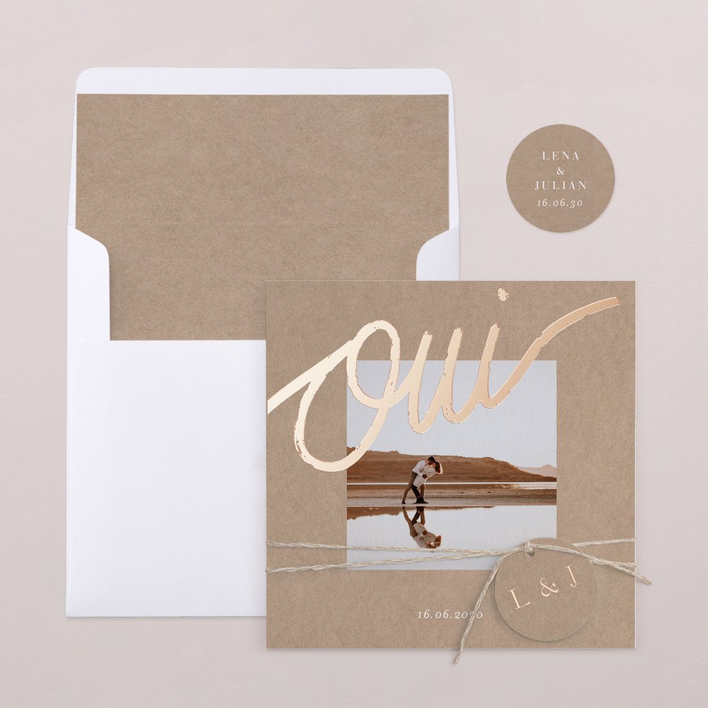 Partagez votre plus beau “oui” avec ceux que vous aimez grâce au faire-part Precious Yes. Lettres ennoblies de finitions cuivrées, papier d’aspect kraft authentique et photographie de votre couple forment un tableau raffiné, parfait pour annoncer la plus belle des journées.