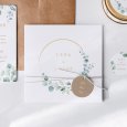 Simplicité et élégance caractérisent le faire-part de mariage Golden Leaves. Avec sa couronne dorée, sublimée de feuilles d’eucalyptus illustrées en aquarelle, ce modèle subtil aux accents naturels donnera le ton d’une cérémonie d’exception.