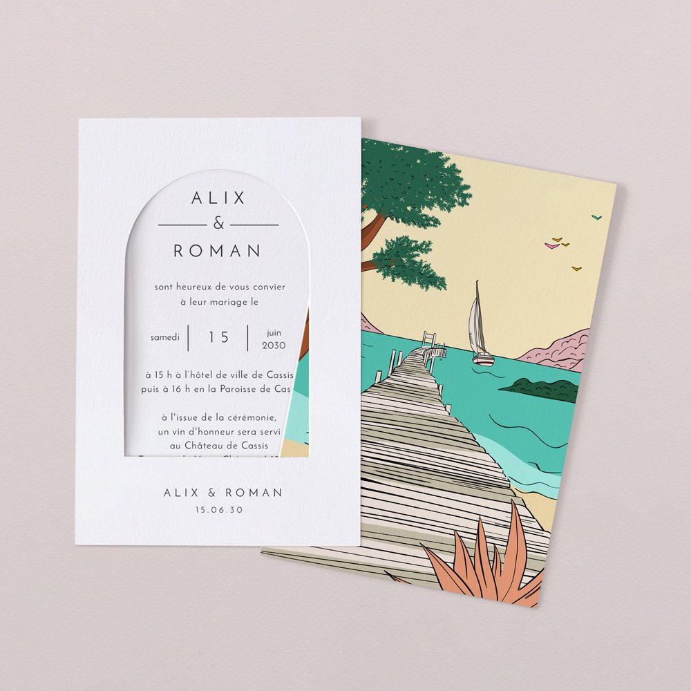 Caractérisé par sa découpe en forme d'alcôve sur la couverture, ce faire-part double volet comprend une carte glissée à l'intérieur.L'ensemble est personnalisable avec les détails de votre évènement.