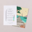 Ponton sur la mer, eau cristaline, pins majestueux et roches rouges : la plage la plus célèbre de Corse et son décor de carte postale nous a inspirés un faire-part illustré qui donne des envies d'ailleurs... Voici le faire-part Palombaggia qui fera craquer les futurs mariés rêvant d'une noce les pieds dans l'eau.