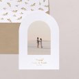Caractérisé par sa découpe en forme d'alcôve sur la couverture, ce faire-part double volet comprend une carte glissée à l'intérieur.L'ensemble est personnalisable avec les détails de votre évènement.