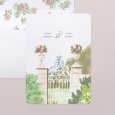 Sur le faire-part de mariage Chateaubriand, votre beau jour se dévoile derrière un superbe portail forgé, surmonté de généreuses fleurs rosées. Abondante végétation et élégante typographie complètent ce modèle aquarellé, qui donnera le ton d’une célébration champêtre chic à ne pas manquer.