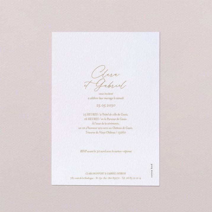 Sur le faire-part de mariage La Traviata, une élégante couronne végétale vient sublimer votre photo de couple préférée. Ennoblie d’or, cette composition contemporaine annoncera, de la plus jolie des façons, votre union prochaine.