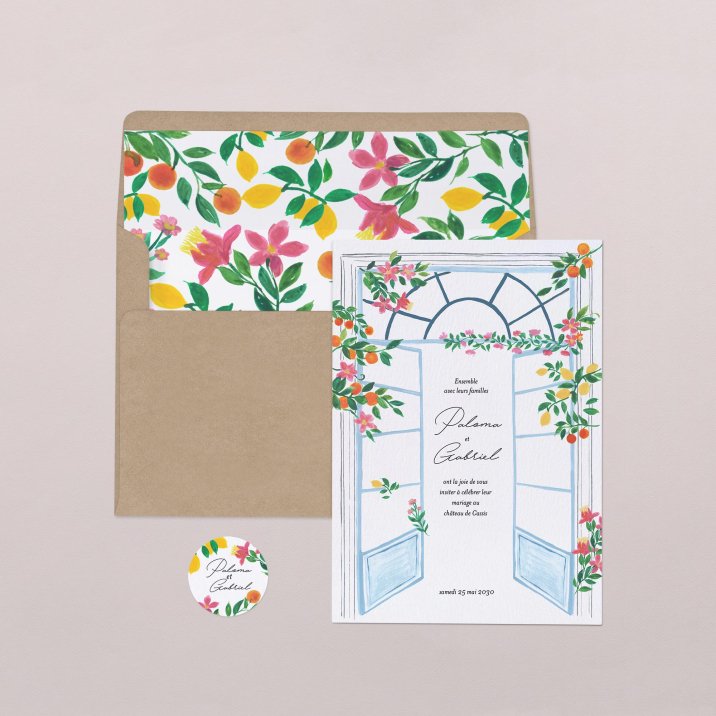 Sur le faire-part de mariage Lamartine, une superbe porte vitrée aux formes arquées dévoile les détails clés de votre beau jour. Un modèle aux délicates aquarelles fleuries et vitaminées, pour une union romantique à souhait.