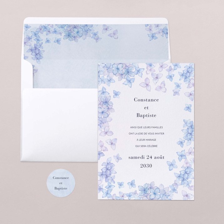 Des fleurs bleues aquarellées viennent s'apposer sur le faire-part de mariage Sweet blue. Toute en délicatesse et en légèreté, cette papeterie contera, avec poésie, votre beau jour à venir à vos invités.